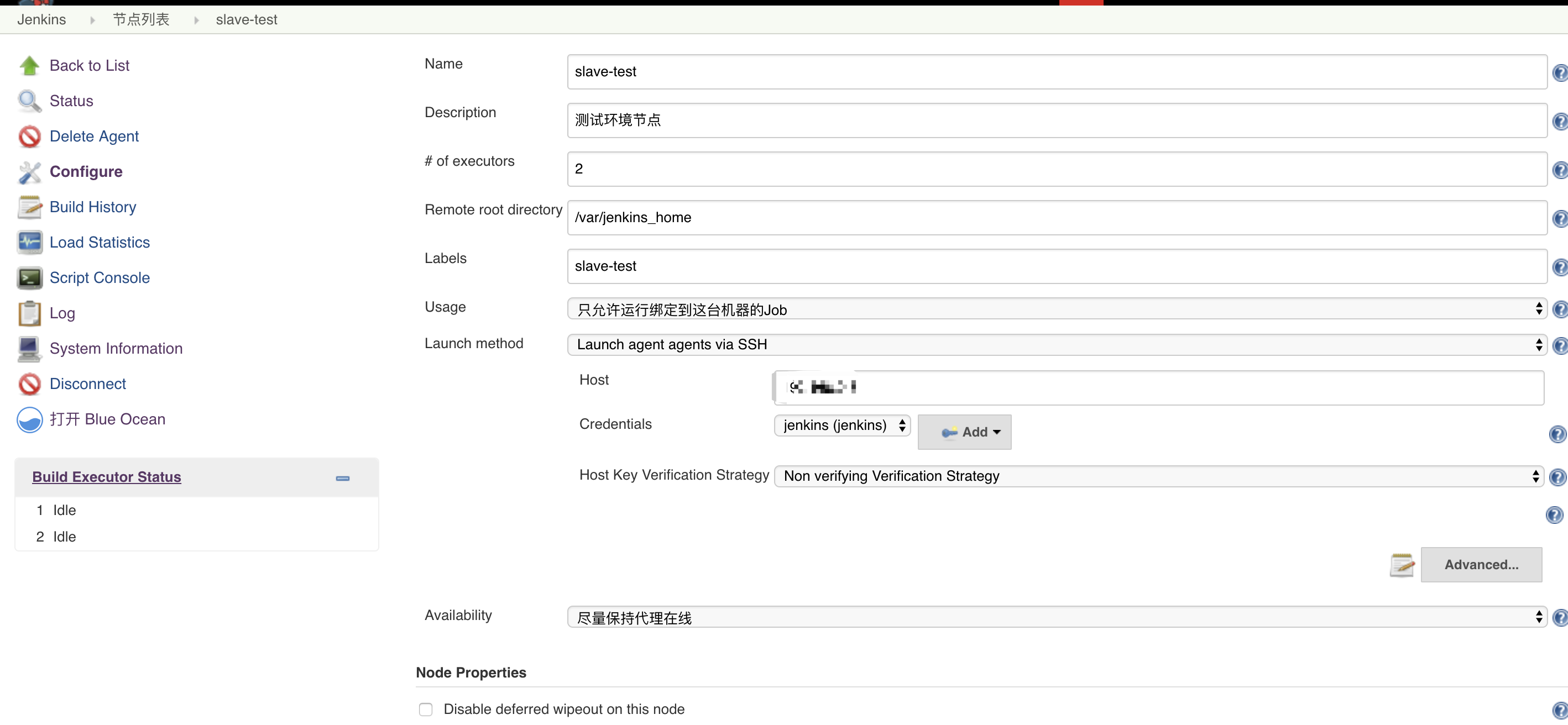 jenkins节点容器有两种,一种是ssh-slave,master使用ssh命令连接节点,另一种是jnlp-slave,节点通过url连接master,以下使用的的是ssl-slave