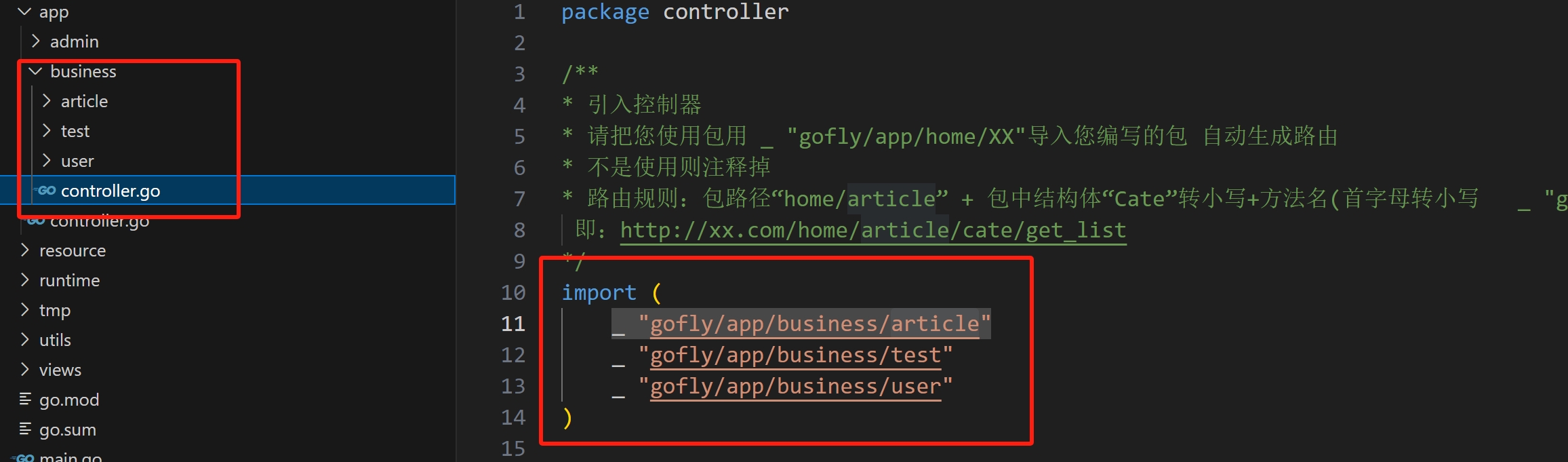 在应用业务目录app下添加一个总的控制器(controller.go)来引入app下模块的路径,例如引入admin、business模块。controller.go代码如下