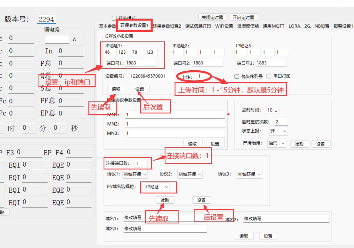 c. 进入环保参数设置1界面设置IP,端口 以及上传时间,可选择以IP或者域名两种形式,设置前请务必先读取一下。