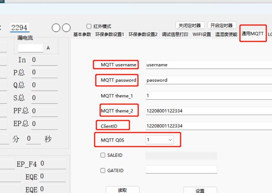 MQTT QOS: 1 (电表需要mqtt服务器的应答,所以需要设置qos:1)