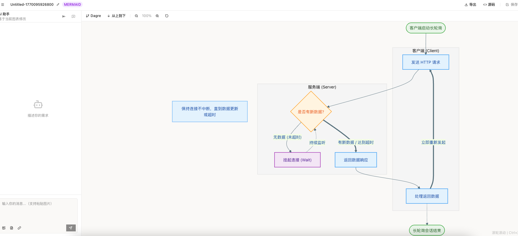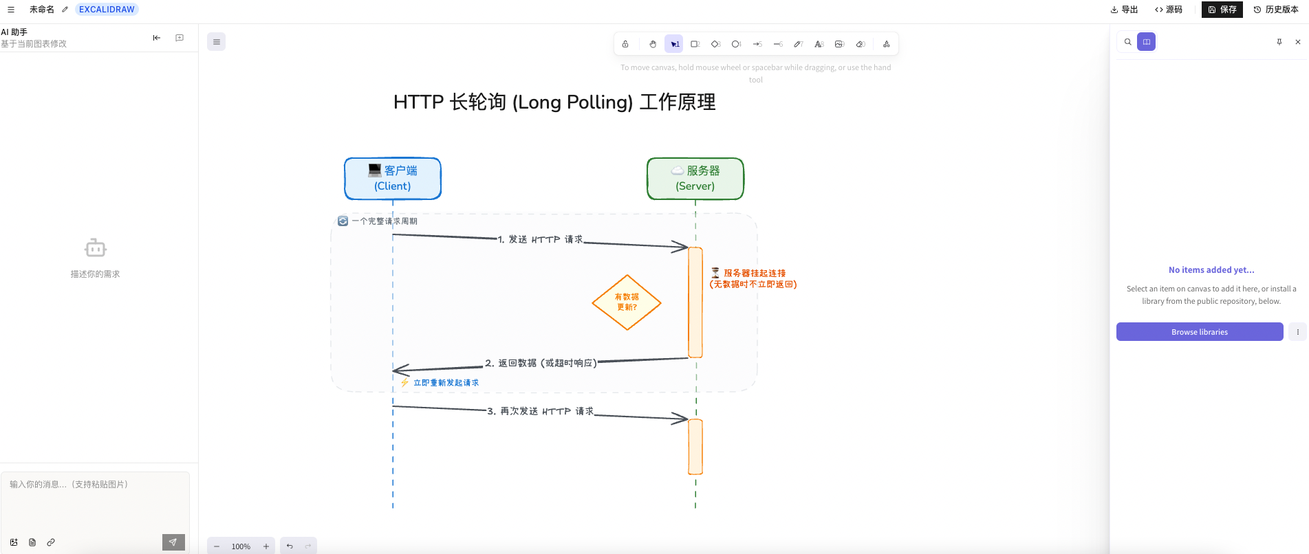 输入: HTTP 长轮询原理图,生成的逻辑线条清晰,手绘质感爆棚。