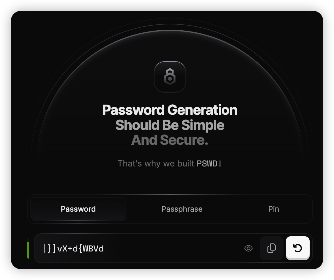 PSWD 不只是生成一串乱码,它支持全能型随机密码(Password:大小写、数字、特殊符号随心控)、密码短语(Passphrase:随机单词组合)、Pin(纯数字模式)