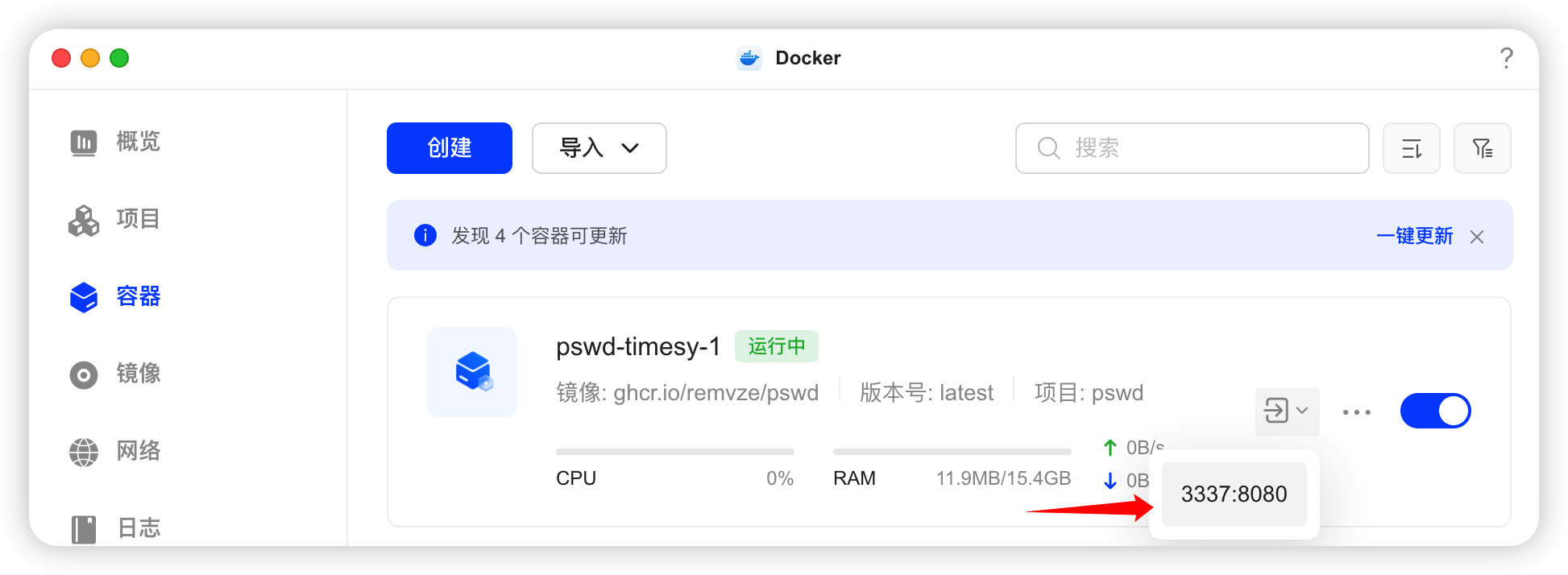 等项目构建成功后,切换到「容器」面板找到 PSWD,点击它旁边的小箭头,或者在浏览器输入 NAS_IP:3337 就能使用 PSWD 了。