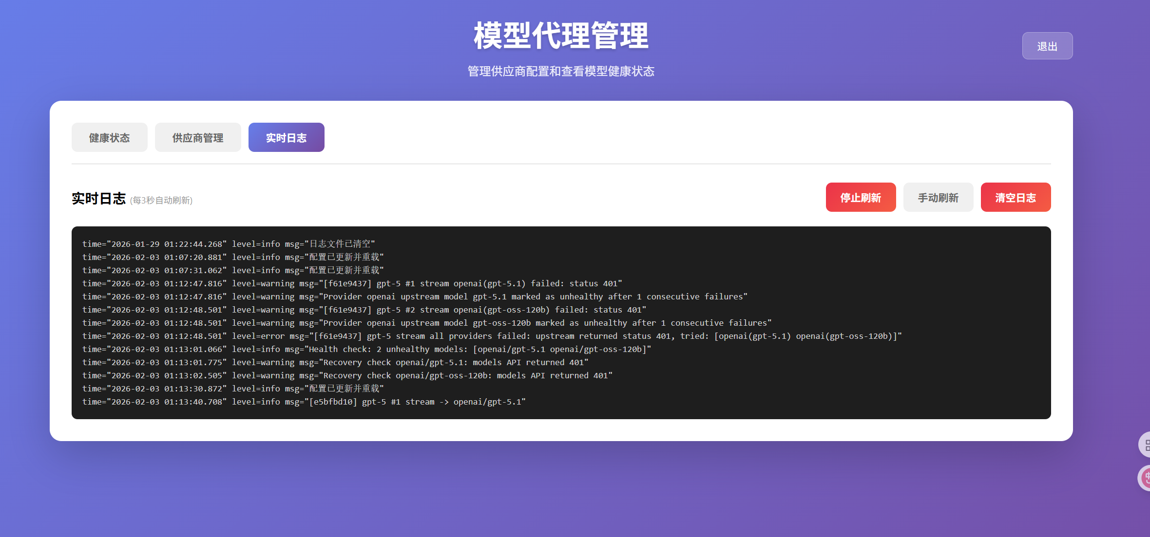 - 提供Web UI,可在线登录并管理供应商和模型配置,在线查看模型使用与健康情况、程序运行日志等