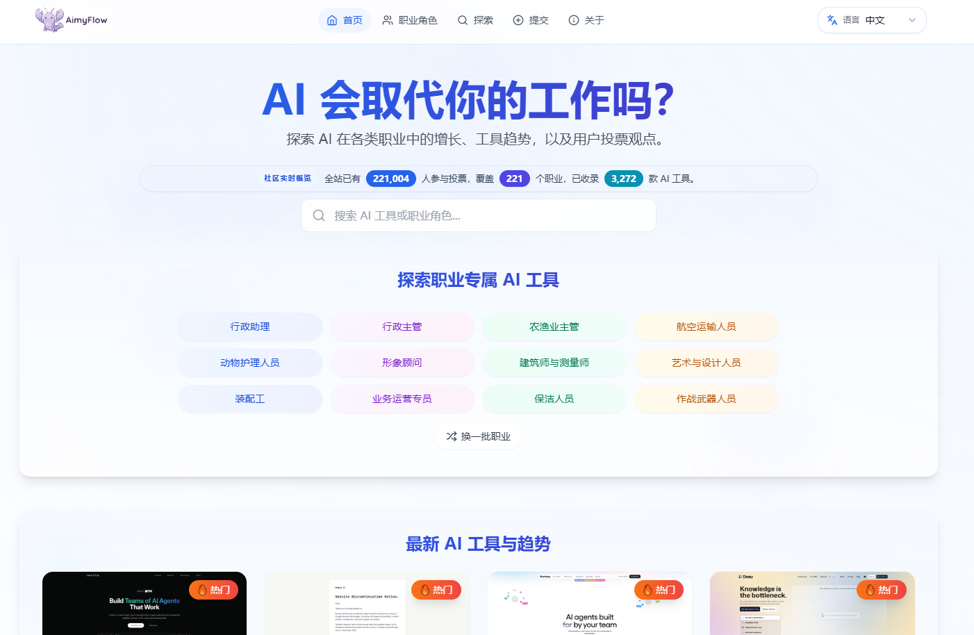 探索 AI 在各类职业中的增长、工具趋势,以及用户投票观点。