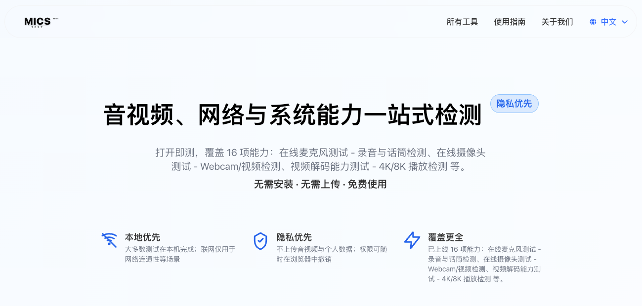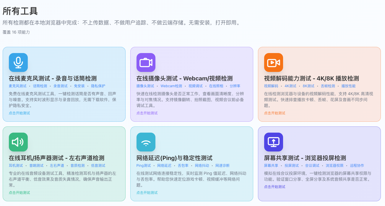 打开即测,覆盖 16 项能力:在线麦克风测试 - 录音与话筒检测、在线摄像头