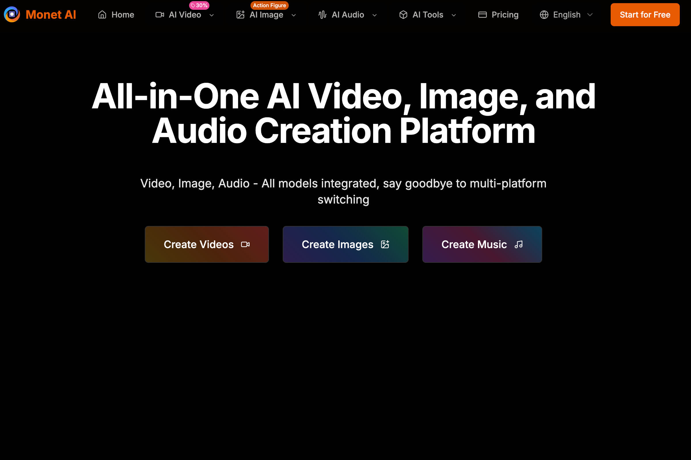 Monet AI 是一个一体化 AI 创作平台——涵盖视频、图像、音频——集成了所有